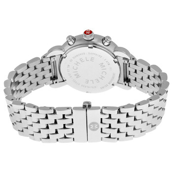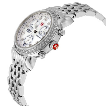 Silver-tone stainless steel case with a silver-tone stainless steel bracelet. Fixed silver-tone stainless steel bezel. Mother of pearl dial with silver-tone hands and diamond hour markers. Minute markers around the outer rim. Dial Type: Analog. Date display at the 6 o'clock position. Chronograph - two sub-dials displaying: 60 second and 30 minute. day of the week. Quartz movement. Scratch resistant sapphire crystal. Pull / push crown. Solid case back. Round case shape. Case size: 33 mm. Deployment clasp. Water resistant at 50 meters / 165 feet. Functions: chronograph, date, hour, minute, second. Dress watch style. Watch label: Swiss Made. Pre-owned Michele CSX Mother of Pearl Diamond Dial Ladies Watch MWW03S000002.