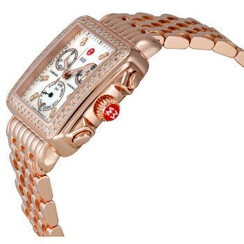 Pre-owned Rose gold-tone stainless steel case and bracelet. Fixed rose gold tone bezel set with 120 diamonds. White dial with rose gold-tone hands and index with diamonds hour markers. Minute markers around the outer rim. Dial Type: Analog. Luminescent hands and markers. Date display at the 6 o'clock position. Chronograph - two sub-dials displaying: 30 minutes and 60 seconds. Day of the week sub-dial at the 6 o'clock position. Quartz movement. Scratch resistant mineral crystal. Solid case back. Case diameter: 33 mm x 35 mm. Case thickness: 11 mm. Rectangle case shape. Band width: 18 mm. Hidden deployment clasp. Water resistant at 50 meters / 165 feet. Functions: chronograph, date, hour, minute, second. Luxury watch style. Watch label: Swiss Movement. Michele Deco Day White Dial Diamond Bezel Rose-Gold Ladies Watch MWW06P000109.