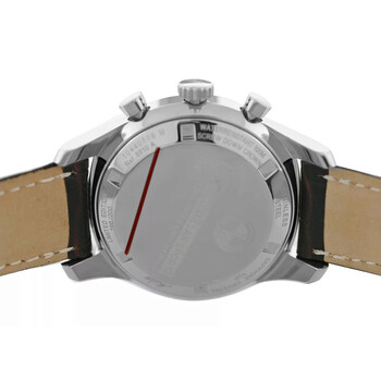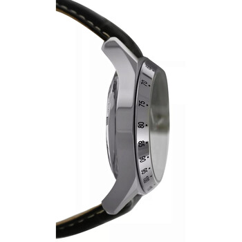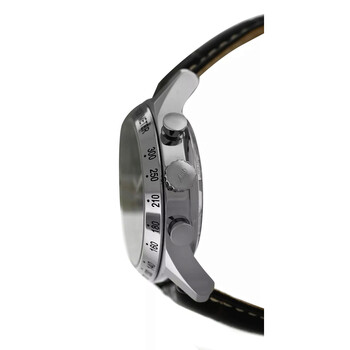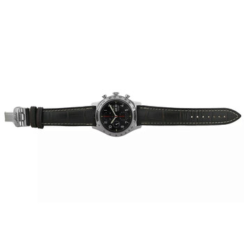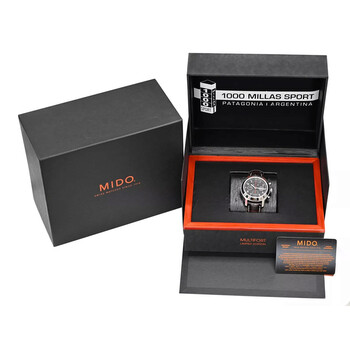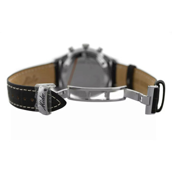 Silver-tone stainless steel case with a black leather strap. Fixed tachymeter scale silver-tone stainless steel bezel. Black dial with silver-tone hands and Arabic numeral & index hour markers. Minute markers around the outer rim. Dial Type: Analog. Luminescent hands and markers. Day of the week and date display at the 3 o'clock position. Chronograph - three sub-dials displaying: 60 second, 30 minute and 12 hour. Automatic movement. Scratch resistant sapphire crystal. Solid case back. Round case shape, case size: 43 mm. Band length: 7.75 inches. Fold over clasp with a safety release. Water resistant at 100 meters / 330 feet. Functions: chronograph, day, date, hour, minute, second. Multifort Patagonia Series. Luxury watch style. Watch label: Swiss Made. Pre-owned Mido Multifort Patagonia Chronograph Automatic Black Dial Men's Watch 8810A.