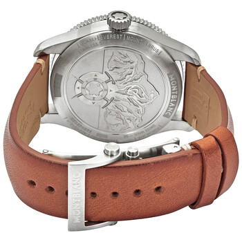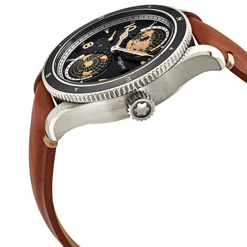 Pre-owned Stainless steel case with a brown (calfskin) leather strap. Bi-directional rotating stainless steel bezel with a black ring showing compass markings. Black dial with luminous silver-tone hands and alternating Arabic numeral and index hour markers. Minute markers around the outer rim. Dial Type: Analog. Luminescent hands and markers. Date display at the 3 o'clock position. Two domed globes, turning in opposite directions, that complete a full rotation in 24 hours subdials. Montblanc calibre MB 29.25 automatic movement with a 42-hour power reserve. Scratch resistant sapphire crystal. Solid case back. Round case shape. Case size: 42 mm. Case thickness: 12.8 mm. Band width: 22 mm. Fold over clasp. Water resistant at 100 meters / 330 feet. Functions: date, hour, minute, 2nd time zone. Luxury watch style. Watch label: Swiss Made. Montblanc 1858 Geosphere Automatic Black Dial Men's Watch 119286.