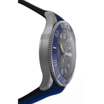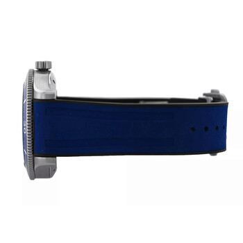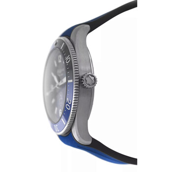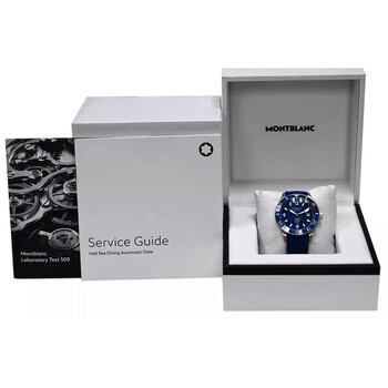 Silver-tone stainless steel case with a blue rubber strap. Blue bezel. Blue dial with silver-tone hands and Arabic numeral & index hour markers. Minute markers around the outer rim. Dial Type: Analog. Luminescent hands and markers. Date display at the 3 o'clock position. Automatic movement. Screw down crown. Solid case back. Round case shape, case size: 41 mm. Band length: 8.25 inches. Deployment with push button release clasp. Water resistant at 300 meters / 1000 feet. Functions: date, hour, minute, second. 1858 Iced Sea Diving Series. Dive watch style. Watch label: Swiss Made. Item Variations: M07578. Pre-owned Montblanc 1858 Iced Sea Diving Automatic Blue Dial Men's Watch MB129370.