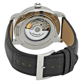 Silver-tone stainless steel case with a black alligator leather strap. Fixed silver-tone stainless steel bezel. Silvery white guilloche dial with luminous rose gold-tone hands and Roman numeral hour markers. Minute markers around the outer rim. Dial Type: Analog. Luminescent hands. Date display above the 6 o'clock position. MontBlanc Calibre MB 24.17 Automatic movement, based upon Sellita SW200-1, containing 26 Jewels, bitting at 28800 vph, and has a power reserve of approximately 38 hours. Scratch resistant sapphire crystal. Pull / push crown. Round case shape, case size: 43 mm, case thickness: 9.84 mm. Band width: 22 mm. Tang clasp. Water resistant at 50 meters / 165 feet. Functions: date, hour, minute, second. 4810 Series. Luxury watch style. Watch label: Swiss Made. Pre-owned MontBlanc 4810 Automatic Men's Watch 114841.