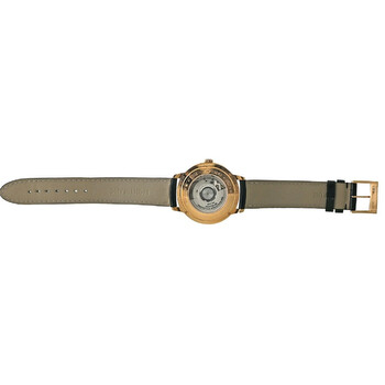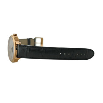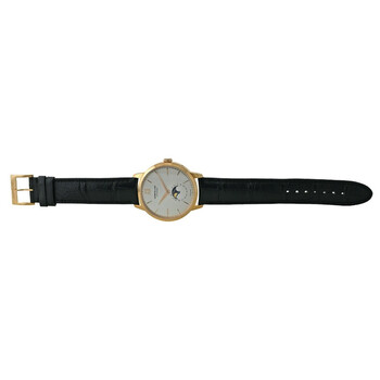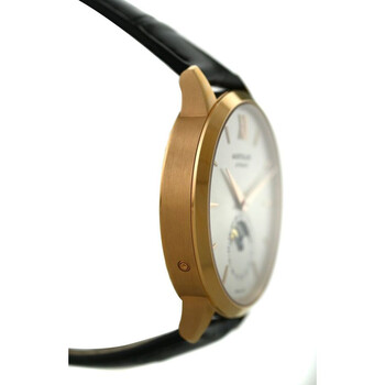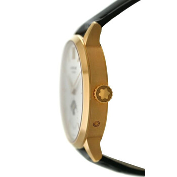 Pre-owned Rose gold-tone 18kt rose gold case with a black leather strap. Fixed rose gold-tone bezel. Silver dial with rose gold-tone hands and index-Roman numeral hour markers. Roman numeral appears at the 12 o'clock position. Dial Type: Analog. Date display at the 6 o'clock position. One subdial displaying: date/moonphase. Montblanc Calibre MB 29.14 Automatic movement, based upon Sellita SW200-1, containing 26 Jewels, bitting at 28800 vph, and has a power reserve of approximately 42 hours. Scratch resistant sapphire crystal. Pull / push crown. Transparent see through case back. Round case shape, case size: 39 mm. Band width: 10.24 mm. Tang clasp. Water resistant at 30 meters / 100 feet. Functions: date, hour, minute, second, moonphase. Meisterstuck Heritage Moonstruck Series. Dress watch style. Watch label: Swiss Made. MontBlanc Meisterstuck Heritage Moonstruck Automatic Silver Dial Men's 18kt Rose Gold Watch 111185.