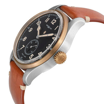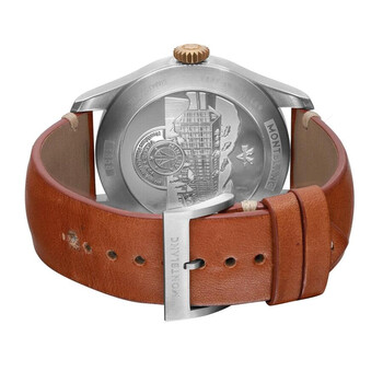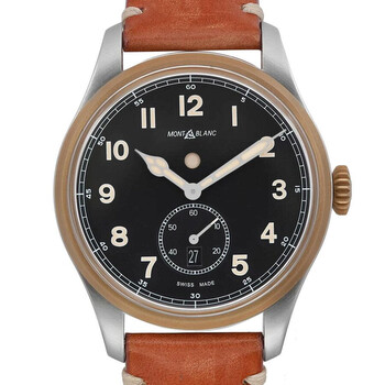 Silver-tone stainless steel case with a brown leather strap. Fixed gold-tone bezel. Black dial with silver-tone hands and Arabic numeral hour markers. Minute markers around the outer rim. Dial Type: Analog. Luminescent hands. Date display at the 6 o'clock position. Two sub-dials displaying: 60 second and 24 hour. MontBlanc Calibre MB 29.19 Automatic movement, based upon Sellita SW300-1, containing 34 Jewels, bitting at 28800 vph, and has a power reserve of approximately 42 hours. Scratch resistant sapphire crystal. Pull / push crown. Solid case back. Round case shape, case size: 44 mm, case thickness: 13 mm. Band width: 20 mm, band length: 7.5 inches. Buckle clasp. Water resistant at 30 meters / 100 feet. Functions: date, GMT, second time zone, hour, minute, small second, day/night indicator. Montblanc 1858 Series. Casual watch style. Watch label: Swiss Made. Pre-owned Montblanc Montblanc 1858 GMT Automatic Day-Night Black Dial Men's Watch MB116479.