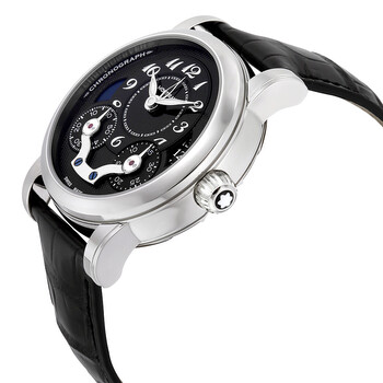Silver-tone stainless steel case with a black leather strap. Fixed silver-tone stainless steel bezel. Black dial with silver-tone hands and Arabic numeral hour markers. Minute markers around an inner circle. Dial Type: Analog. Luminescent hands and markers. Date display at the 3 o'clock position. Chronograph - two sub-dials displaying: 60 second and 30 minute. MontBlanc Calibre MB R200 Automatic movement, containing 40 Jewels, bitting at 28800 vph, and has a power reserve of approximately 72 hours. Scratch resistant sapphire crystal. Pull / push crown. Skeleton case back. Round case shape, case size: 43 mm, case thickness: 14.8 mm. Band width: 22 mm, band length: 7.75 inches. Deployment with push button release clasp. Water resistant at 30 meters / 100 feet. Functions: chronograph, column wheel, monopoussoir, second time zone, date, hour, minute, second, day/night indicator. Nicolas Rieussec Series. Luxury watch style. Watch label: Swiss Made. Pre-owned Montblanc Nicolas Rieussec Chronograph Automatic Day-Night Black Dial Men's Watch 106488.
