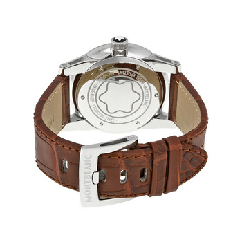 Silver-tone stainless steel case with a brown leather strap. Fixed silver-tone stainless steel bezel. Silver dial with rose gold-tone hands and alternating stick and Arabic numeral hour markers. Minute markers around the outer rim. Dial Type: Analog. Luminescent hands. Date display at the 6 o'clock position. MontBlanc Calibre 4810/401 automatic movement with a 42-hour power reserve. Scratch resistant sapphire crystal. Pull / push crown. Solid case back. Round case shape, case size: 42 mm, case thickness: 11.6 mm. Band length: 7 inches. Tang clasp. Water resistant at 30 meters / 100 feet. Functions: date, hour, minute, second. Casual watch style. Watch label: Swiss Made. Pre-owned Montblanc Timewalker Automatic Silver Dial Brown Leather Men's Watch 101550.