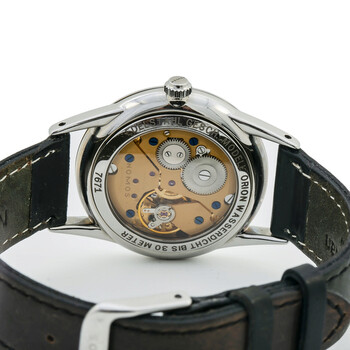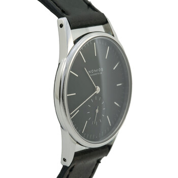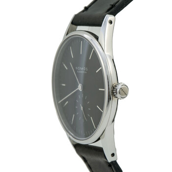 Pre-owned Silver-tone stainless steel case with a anthracite (velour) leather strap. Fixed silver-tone stainless steel bezel. Galvanized anthracite dial with yellow gold-tone stick-style shape hands and index hour markers. Minute markers around the outer rim. Dial Type: Analog. One - small second subdial. Nomos Calibre Alpha hand wind movement with a 43-hour power reserve. Scratch resistant sapphire crystal. Pull / push crown. Transparent case back. Round case shape, case size: 32.8 mm, case thickness: 8.54 mm. Band width: 17 mm. Tang clasp. Water resistant at 30 meters / 100 feet. Functions: hour, minute, small second. Casual watch style. Watch label: Made in Germany. Nomos Orion 1989 November Anthracite Dial Anthracite Dial Ladies Watch 326. Box: No ,Paper: No
