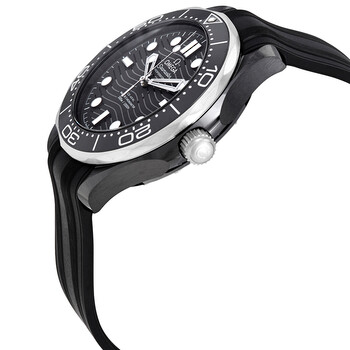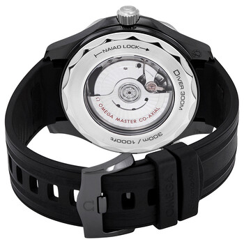 Black ceramic case with a black rubber strap. Uni-directional rotating silver-tone stainless steel with a black ceramic ring bezel. Black dial with luminous silver-tone hands and dot hour markers. Minute markers around the outer rim. Dial Type: Analog. Luminescent hands and markers. Omega Calibre 8806 Automatic movement, containing 35 Jewels, bitting at 25200 vph, and has a power reserve of approximately 55 hours. Scratch resistant sapphire crystal. Screw down crown. Transparent case back. Round case shape, case size: 43.5 mm. Band width: 21 mm. Tang clasp. Water resistant at 300 meters / 1000 feet. Functions: hour, minute, second, co-axial escapement, chronometer, magnetic resistant. Seamaster Series. Dive watch style. Watch label: Swiss Made. Pre-owned Omega Automatic Chronometer Black Dial Watch 210.92.44.20.01.001.
