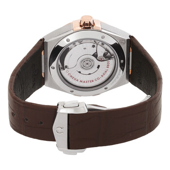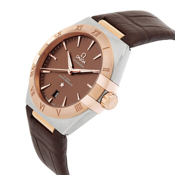 Stainless steel and 18kt sedna rose gold case with a brown leather strap. Fixed 18kt sedna rose gold bezel. Brown dial with 18kt sedna rose gold hands and index hour markers. Dial Type: Analog. Date display at the 6 o'clock position. Omega Calibre 8800 Automatic movement, containing 35 Jewels, bitting at 25200 vph, and has a power reserve of approximately 55 hours. Anti-reflective scratch resistant sapphire crystal. Pull / push crown. Transparent see through case back. Round case shape, case size: 39 mm. Band width: 24.2 mm. Push button deployant buckle clasp. Water resistant at 50 meters. Functions: date, hour, minute, second. Constellation Automatic Series. Luxury watch style. Watch label: Swiss Made. Omega Constellation Automatic Brown Dial Watch 13123392013001.