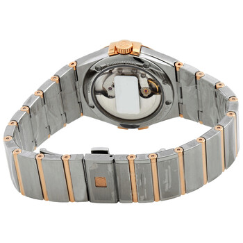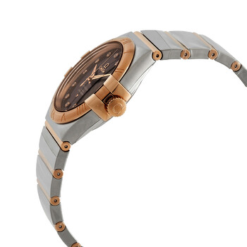 Pre-owned Stainless steel case with a stainless steel bracelet with 18kt rose gold bars. Fixed 18kt rose gold bezel. Brown dial with luminous gold-tone dauphine-style hands and diamond hour markers. Minute markers around the outer rim. Dial Type: Analog. Date display at the 3 o'clock position. Omega calibre 2500 automatic movement, based upon ETA 2892-A2, containing 27 Jewels, bitting at 25200 vph, and has a power reserve of approximately 48 hours. Scratch resistant sapphire crystal. Transparent case back. Round case shape. Case size: 35 mm. Band width: 23 mm. Fold over clasp with a push button release. Water resistant at 100 meters / 330 feet. Functions: hours, minutes, seconds, calendar. Constellation Series. Dress watch style. Watch label: Swiss Made. Item Variations: 123 20 35 20 63 001, 123-20-35-20-63-001, 123/20/35/20/63/001, 12320352063001. Omega Constellation Brown Dial Two Tone 35 mm Men's Watch 123.20.35.20.63.001.