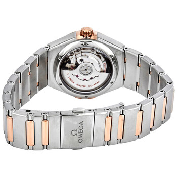 Silver-tone stainless steel case with a silver-tone stainless steel with 18kt sedna gold bars bracelet. Fixed 18kt sedna gold set with diamonds bezel. Mother of pearl dial with rose gold-tone skeleton hands and diamond hour markers. Dial Type: Analog. Date display 6 o'clock position. Omega Co-Axial Master Chronometer Calibre 8700 automatic movement with a 50-hour power reserve. Scratch resistant sapphire crystal. Pull / push crown. Transparent case back. Round case shape, case size: 29 mm. Band width: 17.6 mm. Push button fold over clasp. Water resistant at 50 meters / 165 feet. Functions: date, hour, minute. Constellation Manhattan Series. Dress watch style. Watch label: Swiss Made. Pre-owned Omega Constellation Manhattan Automatic Diamond Ladies Watch 131.25.29.20.55.001.