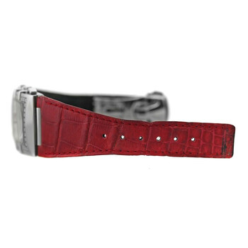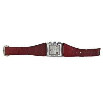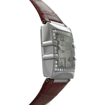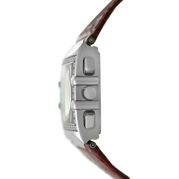 Silver-tone stainless steel case with a red leather strap. Fixed silver-tone bezel with diamond set stainless steel. White dial with silver-tone hands and Arabic numeral hour markers. Minute markers around the outer rim. Dial Type: Analog. Quartz movement. Scratch resistant sapphire crystal. Solid case back. Square case shape, case size: 28 mm. Band length: 7 inches. Fold over clasp with a safety release. Functions: chronograph, hour, minute, second. Constellation Quadra Series. Luxury watch style. Watch label: Swiss Made. Pre-owned Omega Constellation Quadra Chronograph Quartz Diamond White Dial Ladies Watch 1847.73.31.