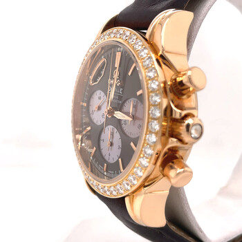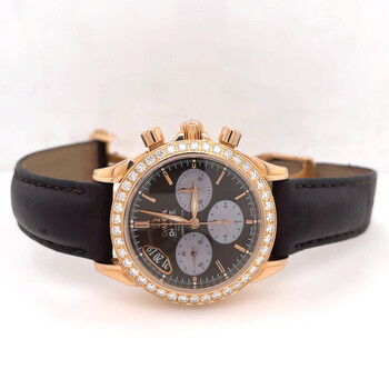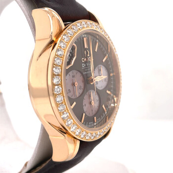 Rose gold-tone 18kt rose gold case with a brown leather strap. Fixed rose gold-tone bezel with diamond set 18kt rose gold. Brown dial with rose gold-tone hands and index hour markers. Minute markers around the outer rim. Dial Type: Analog. Luminescent hands and markers. Date display between 10 and 11 o'clock position. Chronograph - three sub-dials displaying: 60 second, 30 minute and 12 hour. Automatic movement. Scratch resistant sapphire crystal. Pull / push crown. Transparent case back. Round case shape, case size: 35 mm, case thickness: 13 mm. Band width: 16 mm. Deployment with push button release clasp. Water resistant at 100 meters / 330 feet. Functions: chronograph, date, hour, minute, second. De Ville Co-axial Series. Luxury watch style. Watch label: Swiss Made. Pre-owned Omega De Ville Co-Axial Chronograph Automatic Diamond Brown Dial Ladies Watch 4677.60.37.
