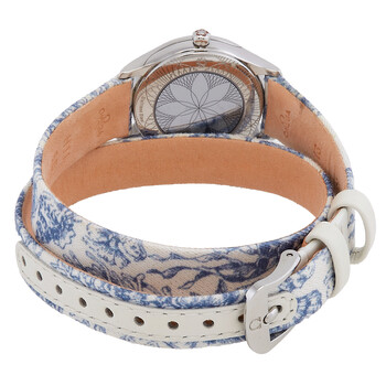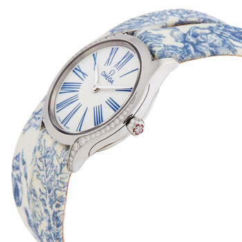 Silver-tone stainless steel case with a multicolor toile de jouy fabric strap. Fixed silver-tone stainless steel bezel set with diamonds. White dial with silver-tone hands and Roman numeral hour markers. Dial Type: Analog. Omega Calibre 4061 quartz movement. Scratch resistant sapphire crystal. Pull / push crown. Solid case back. Round case shape, case size: 26 mm, case thickness: 7.5 mm. Band width: 13 mm. Fold over clasp with a safety release. Water resistant at 30 meters / 100 feet. Functions: hour, minute. De Ville Series. Luxury watch style. Watch label: Swiss Made. Omega De Ville Quartz Diamond White Dial Ladies Watch 428.17.26.60.04.001.