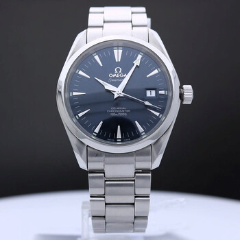 Silver-tone stainless steel case and bracelet. Fixed silver-tone stainless steel bezel. Blue dial with silver-tone hands and index hour markers. Minute markers around the outer rim. Dial Type: Analog. Luminescent hands and markers. Date display at the 3 o'clock position. Automatic movement. Scratch resistant sapphire crystal. Screw down crown. Transparent see through case back. Round case shape, case size: 39 mm. Band length: 7.5 inches. Fold over clasp with a safety release. Water resistant at 150 meters / 500 feet. Functions: date, hour, minute, second. Seamaster Series. Luxury watch style. Watch label: Swiss Made. Item Variations: 2503.80, 2503.80.00, 2503-80, 2503-80-00, 2503/80, 250380, 2503. Pre-owned Omega Seamaster Automatic Blue Dial Men's Watch 2503.8.