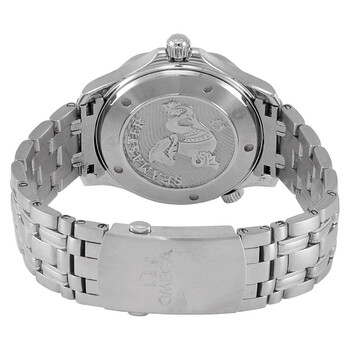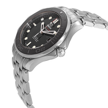 Silver-tone stainless steel case and bracelet. Uni-directional rotating grey bezel. Black dial with silver-tone skeleton hands and dot hour markers. Minute markers around the outer rim. Dial Type: Analog. Luminescent hands and markers. Date display at the 3 o'clock position. Omega Calibre 2500 Automatic movement, based upon ETA 2892-A2, containing 27 Jewels, bitting at 25200 vph, and has a power reserve of approximately 48 hours. Scratch resistant sapphire crystal. Screw down crown. Solid case back. Round case shape, case size: 41 mm, case thickness: 12 mm. Band width: 20 mm, band length: 7 1/2 inches. Double push button deployment clasp. Water resistant at 300 meters / 1000 feet. Functions: date, hour, minute, second, co-axial escapement, chronometer. Seamaster Series. Dive watch style. Watch label: Swiss Made. Pre-owned Omega Seamaster Automatic Chronometer Black Dial Men's Watch OM21230412001003.