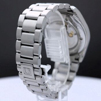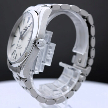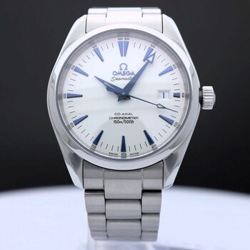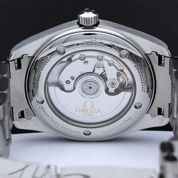 Silver-tone stainless steel case and bracelet. Fixed silver-tone stainless steel bezel. Silver-tone dial with blue hands and index hour markers. Minute markers around the outer rim. Dial Type: Analog. Luminescent hands and markers. Date display at the 3 o'clock position. Automatic movement. Screw down crown. Transparent see through case back. Round case shape, case size: 39 mm. Band length: 7.25 inches. Fold over clasp with a safety release. Water resistant at 150 meters / 500 feet. Functions: date, hour, minute, second. Seamaster Series. Luxury watch style. Watch label: Swiss Made. Pre-owned Omega Seamaster Automatic Silver Dial Men's Watch 2503.33.