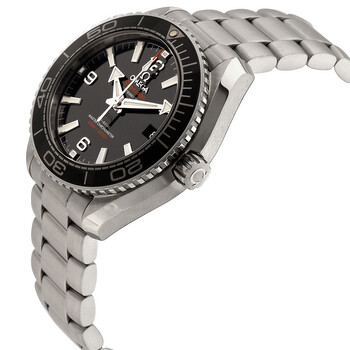 Silver-tone stainless steel case and bracelet. Uni-directional rotating coin edge silver-tone stainless steel with a black ceramic top ring bezel. Black dial with silver-tone arrow-shaped hands and index hour markers. Arabic numerals mark the 6, 9 and 12 o'clock positions. Minute markers around the outer rim. Dial Type: Analog. Luminescent hands and markers. Date display at the 3 o'clock position. Omega Calibre 8800 Automatic movement, containing 35 Jewels, bitting at 25200 vph, and has a power reserve of approximately 55 hours. Scratch resistant sapphire crystal. Screw down crown. Transparent see through case back. Round case shape, case size: 39.5 mm, case thickness: 14.16 mm. Band width: 21 mm, band length: 7 1/4 inches. Fold over clasp with a push button release. Water resistant at 600 meters / 2000 feet. Functions: date, hour, minute, second, co-axial escapement, chronometer. Additional Info: helium escape valve. Seamaster Planet Ocean Series. Dive watch style. Watch label: Swiss Made. Pre-owned Omega Seamaster Planet Ocean Automatic Chronometer Black Dial Men's Watch 215.30.40.20.01.001.
