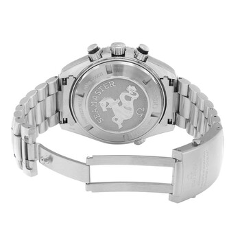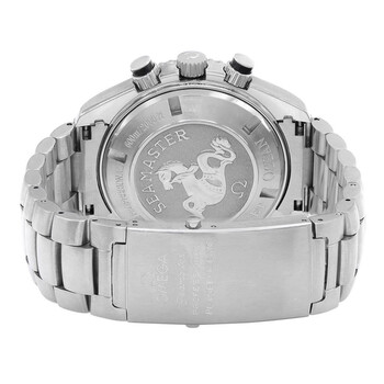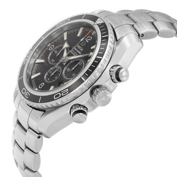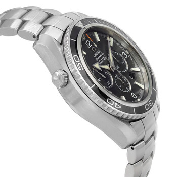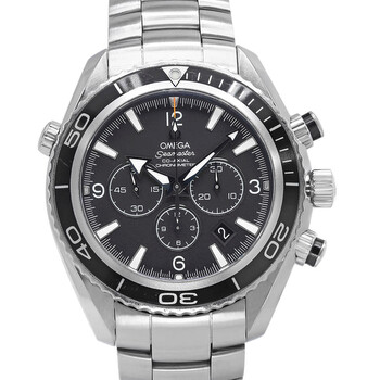 Silver-tone stainless steel case and bracelet. Uni-directional rotating black ceramic bezel. Black dial with silver-tone hands and Arabic numeral & index hour markers. Minute markers around the outer rim. Dial Type: Analog. Luminescent hands and markers. Between the 4 and 5 o'clock position. Chronograph - sub-dials displaying: 12 hour, 30 minute, 60 second. Omega Calibre 3313 Automatic movement, based upon Piguet 1285, containing 37 Jewels, bitting at 28800 vph, and has a power reserve of approximately 52 hours. Scratch resistant sapphire crystal. Screw down crown. Solid case back. Round case shape, case size: 45.5 mm, case thickness: 18 mm. Band width: 20 mm, band length: 7.5 inches. Fold over with double push button release clasp. Water resistant at 600 meters / 2000 feet. Functions: chronograph, date, hour, minute, second, co-axial escapement, chronometer. Omega Seamaster Planet Ocean Series. Dive watch style. Watch label: Swiss Made. Pre-owned Omega Omega Seamaster Planet Ocean Chronograph Automatic Chronometer Black Dial Men's Watch 2210.50.00.