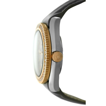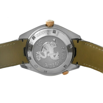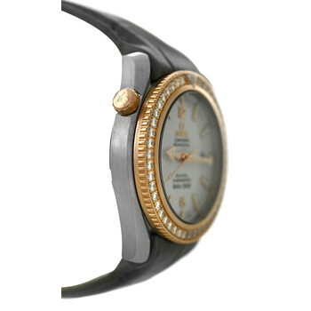 Silver-tone stainless steel case with a black leather strap. Uni-directional rotating 18kt rose gold set with diamonds bezel. Lacquered white dial with luminous rose gold-tone hands and index hour markers. Arabic numerals mark the 6, 9 and 12 o'clock positions. Minute markers around the outer rim. Dial Type: Analog. Luminescent hands and markers. Date display at the 3 o'clock position. Omega Calibre 2500 Automatic movement, based upon ETA 2892-A2, containing 27 Jewels, bitting at 25200 vph, and has a power reserve of approximately 48 hours. Scratch resistant sapphire crystal. Screw down crown. Solid case back. Round case shape, case size: 42 mm. Band width: 20 mm, band length: 7.75 inches. Deployment clasp. Water resistant at 600 meters / 2000 feet. Functions: date, hour, minute, second. Seamaster Planet Ocean Series. Dive watch style. Watch label: Swiss Made. Pre-owned Omega Seamaster Planet Ocean Diamond Lacquered White Dial Unisex Watch 222.28.42.20.04.001.