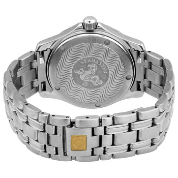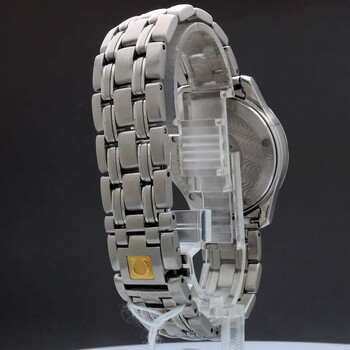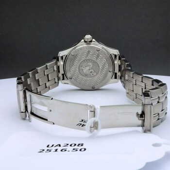 Silver-tone stainless steel case and bracelet. Uni-directional rotating silver-tone stainless steel bezel. Black dial with silver-tone hands and index hour markers. Minute markers around the outer rim. Dial Type: Analog. Luminescent hands and markers. Date display at the 3 o'clock position. Quartz movement. Scratch resistant sapphire crystal. Screw down crown. Solid case back. Round case shape, case size: 36 mm. Band length: 8 inches. Hidden clasp. Water resistant at 200 meters / 660 feet. Functions: date, hour, minute, second. Seamaster Series. Luxury watch style. Watch label: Swiss Made. Pre-owned Omega Seamaster Quartz Black Dial Men's Watch 2516.5.