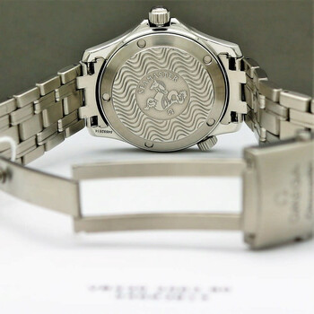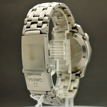 Silver-tone stainless steel case and bracelet. Uni-directional rotating silver-tone stainless steel bezel. Blue dial with silver-tone hands and index hour markers. Minute markers around the outer rim. Dial Type: Analog. Luminescent hands and markers. Date display at the 3 o'clock position. Omega Calibre 1538 quartz movement. Scratch resistant sapphire crystal. Screw down crown. Solid case back. Round case shape, case size: 36 mm. Band length: 7 inches. Deployment with push button release clasp. Water resistant at 300 meters / 1000 feet. Functions: date, hour, minute, second, battery eol indicator, chronometer. Seamaster Series. Luxury watch style. Watch label: Swiss Made. Pre-owned Omega Seamaster Quartz Chronometer Blue Dial Men's Watch 2562.8.