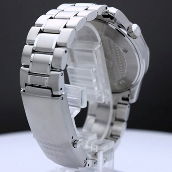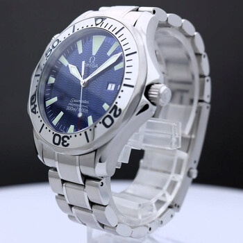 Silver-tone stainless steel case and bracelet. Uni-directional rotating silver-tone stainless steel bezel. Blue dial with silver-tone hands and index hour markers. Minute markers around the outer rim. Dial Type: Analog. Luminescent hands and markers. Date display at the 3 o'clock position. Omega Calibre 1538 quartz movement. Scratch resistant sapphire crystal. Screw down crown. Solid case back. Round case shape, case size: 41 mm. Band length: 7.25 inches. Fold over clasp with a safety release. Water resistant at 300 meters / 1000 feet. Functions: date, hour, minute, second, battery eol indicator, chronometer. Seamaster Series. Dive watch style. Watch label: Swiss Made. Item Variations: 2265.80, 2265.80.00, 2265-80, 2265-80-00, 2265/80, 226580, 2265. Pre-owned Omega Seamaster Quartz Chronometer Blue Dial Men's Watch 2265.8.