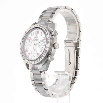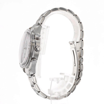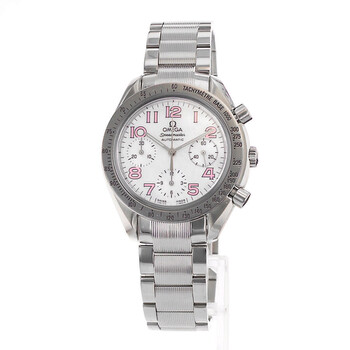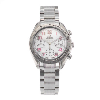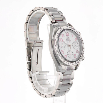 Silver-tone stainless steel case and bracelet. Fixed tachymeter scale silver-tone stainless steel bezel. Mother of pearl dial with silver-tone hands and Arabic numeral hour markers. Minute markers around the outer rim. Dial Type: Analog. Luminescent hands and markers. Chronograph - three sub-dials displaying: 60 second, 30 minute and 12 hour. Automatic movement. Screw down crown. Solid case back. Round case shape, case size: 39 mm. Fold over clasp with a safety release. Functions: chronograph, hour, minute, second. Speedmaster Series. Luxury watch style. Watch label: Swiss Made. Pre-owned Omega Speedmaster Chronograph Automatic Ladies Watch 3534.74.