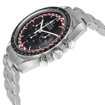 Pre-owned Stainless steel case with a stainless steel bracelet. Fixed black aluminium bezel showing tachymeter markings. Black dial with luminous hands and index hour markers. Minute markers around the outer rim. Dial Type: Analog. Luminescent hands and markers. Chronograph - three sub-dials displaying: 60 second, 30 minute and 12 hour. Manual wind movement with a 48-hour power reserve. Scratch resistant hesalite crystal. Pull / push crown. Solid case back. Case diameter: 42 mm. Round case shape. Band width: 22.9 mm. Band length: 9 inches. Deployment clasp. Water resistant at 50 meters / 165 feet. Functions: chronograph, tachymeter, hour, minute, second. Luxury watch style. Watch label: Swiss Made. Omega Speedmaster Moonwatch Black Dial Stainless Steel Men's Watch 31130423001004.