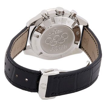 Silver-tone stainless steel case and bracelet. Fixed black stainless steel bezel. Black dial with silver-tone hands. Dial Type: Analog. Date display at the 6 o'clock position. Automatic movement. Scratch resistant sapphire crystal. Pull / push crown. Round case shape, case size: 44 mm. Band length: 7 1/4 inches. Fold over clasp. Functions: date, hour, minute, second. Speedmaster Olympic Edition Series. Luxury watch style. Watch label: Swiss Made. Pre-owned Omega Speedmaster Olympic Edition Automatic Black Dial Men's Watch 321.30.44.52.01.001.