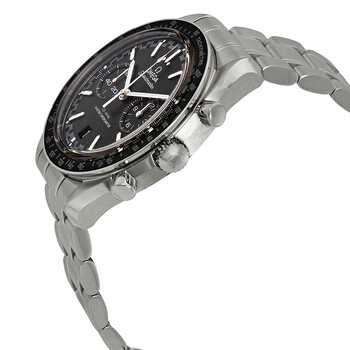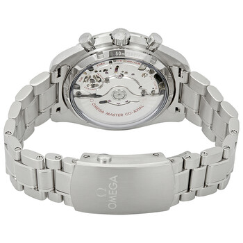 Pre-owned Stainless steel case with a stainless steel bracelet. Fixed stainless steel bezel with a black ceramic top ring showing tachymeter markings. Black dial with luminous silver-tone hands and index hour markers. Minute markers around the outer rim. Dial Type: Analog. Luminescent hands and markers. Date display at the 6 o'clock position. Chronograph - two sub-dials displaying: 60 second and 12 hour. Omega Calibre 9900 Automatic movement, based upon Omega 9300, containing 54 Jewels, bitting at 28800 vph, and has a power reserve of approximately 60 hours. Scratch resistant sapphire crystal. Pull / push crown. Transparent case back. Round case shape. Case size: 44.25 mm. Band width: 21 mm. Fold over clasp with push button release. Water resistant at 50 meters / 165 feet. Functions: chronograph, tachymeter, column wheel, date, hour, minute, second, co-axial escapement, chronometer. Speedmaster Racing Master Series. Luxury watch style. Watch label: Swiss Made. Omega Speedmaster Racing Master Chronograph Automatic Chronometer Black Dial Men's Watch 329.30.44.51.01.001.
