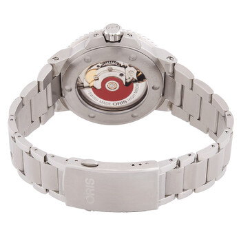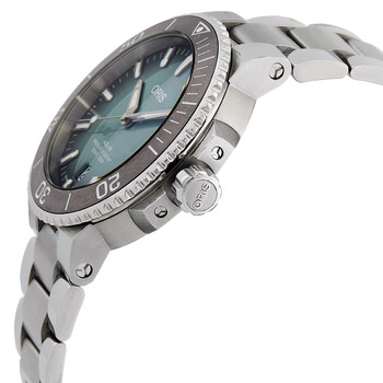 Silver-tone stainless steel case and bracelet. Uni-directional rotating black bezel. Green dial with silver-tone hands and index hour markers. Minute markers around the outer rim. Dial Type: Analog. Date display at the 6 o'clock position. Oris Calibre 733 Automatic movement, based upon Sellita SW200-1, containing 26 Jewels, bitting at 28800 vph, and has a power reserve of approximately 38 hours. Anti-reflective scratch resistant sapphire crystal. Screw down crown. Transparent case back. Round case shape, case size: 39.5 mm. Push button folding clasp. Water resistant at 300 meters / 1000 feet. Functions: date, hour, minute, second. Aquis Series. Dive watch style. Watch label: Swiss Made. Oris Aquis Automatic Green Dial Watch 01 733 7732 4137-07 8 21 05PEB.