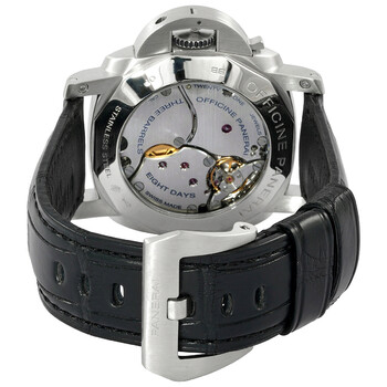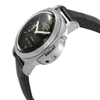Silver-tone stainless steel case with a black leather strap. Fixed silver-tone stainless steel bezel. Black dial with luminous hands and index hour markers. Arabic numerals mark the 6 and 12 o'clock position. Dial Type: Analog. Luminescent hands and dial markers. Date display at the 3 o'clock position. Two sub-dials displaying: 24 hour/60 minute and power reserve indicator. Panerai Calibre P.2002 Hand Wind movement, containing 21 Jewels, composed of 247 parts, bitting at 28800 vph, and has a power reserve of approximately 192 hours. Scratch resistant sapphire crystal. Fluted locked with security brake lever crown. Sapphire crystal skeleton case back. Cushion case shape, case size: 44 mm, case thickness: 17.5 mm. Band width: 24 mm. Deployment with push button release clasp. Water resistant at 100 meters / 330 feet. Functions: GMT, second time zone, date, hour, minute, small second, power reserve indicator, day/night indicator. Luminor 1950 8 Days Gmt Series. Sport watch style. Watch label: Swiss Made. Pre-owned Panerai Luminor 1950 8 Days GMT Hand Wind Day-Night Black Dial Men's Watch PAM00233.