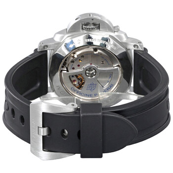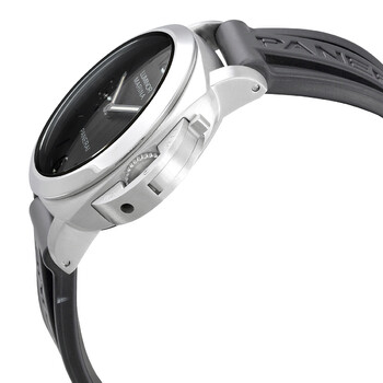 Silver-tone stainless steel case with a black rubber strap. Fixed silver-tone stainless steel bezel. Black dial with silver-tone hands and stick hour markers. Arabic numerals mark the 6, 9 and 12 o'clock positions. Dial Type: Analog. Luminescent hands and markers. Date display at the 3 o'clock position. Small second sub dial at the 9 o'clock position subdials. Panerai Calibre P.9000 Automatic movement, containing 28 Jewels, composed of 197 parts, bitting at 28800 vph, and has a power reserve of approximately 72 hours. Scratch resistant sapphire crystal. Screw down crown. Skeleton case back. Cushion case shape, case size: 44 mm. Band width: 24 mm. Tang clasp. Water resistant at 300 meters / 1000 feet. Functions: date, hour, minute, small second. Luminor 1950 Series. Dress watch style. Watch label: Swiss Made. Pre-owned Panerai Luminor 1950 Automatic Black Dial Men's Watch PAM00312.