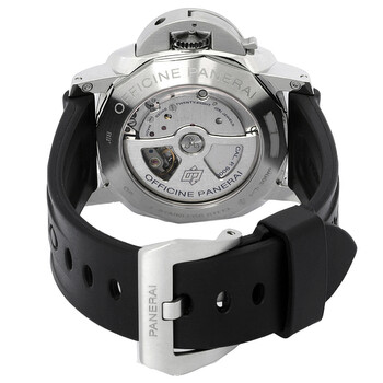 Silver-tone stainless steel case with a black rubber strap. Fixed silver-tone stainless steel bezel. White dial with luminous hands and Arabic numeral hour markers. Minute markers around the outer rim. Dial Type: Analog. Luminescent hands and markers. Date display at the 3 o'clock position. One subdial displaying: small second. Panerai Calibre P.9000 Automatic movement, containing 28 Jewels, composed of 197 parts, bitting at 28800 vph, and has a power reserve of approximately 72 hours. Scratch resistant sapphire crystal. Screw down crown. Skeleton case back. Cushion case shape, case size: 44 mm, case thickness: 17.6 mm. Band width: 22.9 mm. Tang clasp. Water resistant at 300 meters / 1000 feet. Functions: date, hour, minute, small second. Luminor 1950 Series. Luxury watch style. Watch label: Swiss Made. Pre-owned Panerai Luminor 1950 Automatic White Dial Men's Watch PAM00499.