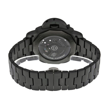 Black ceramic case and bracelet. Fixed black ceramic bezel. Black dial with rose gold-tone hands and Arabic numeral hour markers. Dial Type: Analog. Luminescent hands. Date display at the 3 o'clock position. One subdial displaying: small second at the 9 o'clock position. Panerai Calibre P.9001/B automatic movement with a 72-hour power reserve. Scratch resistant sapphire crystal. Screw down crown. Skeleton case back. Cushion case shape, case size: 44 mm, case thickness: 18 mm. Band width: 22.9 mm. Deployment clasp. Water resistant at 100 meters / 330 feet. Functions: date, hour, minute, second. Tuttonero Series. Luxury watch style. Watch label: Swiss Made. Pre-owned Panerai Luminor 1950 Tuttonero GMT Black Dial Men's Watch PAM00438.