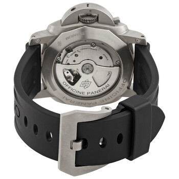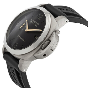 Silver-tone titanium case with a black rubber strap. Fixed silver-tone titanium bezel. Black dial with gold-tone hands and Arabic numeral and index hour markers. Dial Type: Analog. Luminescent hands. Date display at the 3 o'clock position. One subdial displaying: small second. Automatic movement with a 72-hour power reserve. Scratch resistant sapphire crystal. Screw down crown. Transparent case back. Cushion case shape, case size: 44 mm, case thickness: 15 mm. Band width: 24 mm. Buckle clasp. Water resistant at 300 meters / 1000 feet. Functions: hour, minute, small second. Luminor Series. Luxury watch style. Watch label: Swiss Made. Pre-owned Panerai Luminor Automatic Black Dial Men's Watch PAM00351.