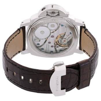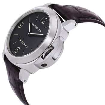 Silver-tone stainless steel case with a black leather strap. Fixed silver-tone stainless steel bezel. Black dial with luminous hands and index hour markers. Arabic numerals mark the 3, 6, 9, and 12 o'clock positions. Dial Type: Analog. Luminescent hands and markers. Panerai Calibre OP X Hand Wind movement, based upon ETA 6497-1, containing 17 Jewels, bitting at 21600 vph, and has a power reserve of approximately 56 hours. Scratch resistant sapphire crystal. Protected steel crown. Solid case back. Cushion case shape. Case size: 44 mm. Tang clasp. Water resistant at 300 meters / 1000 feet. Functions: hour, minute. Dive watch style. Watch label: Swiss Made. Panerai Luminor Base Black Dial and Leather Strap Men's Watch 00112.