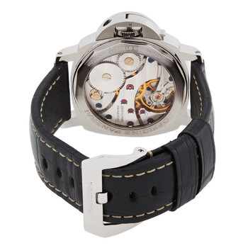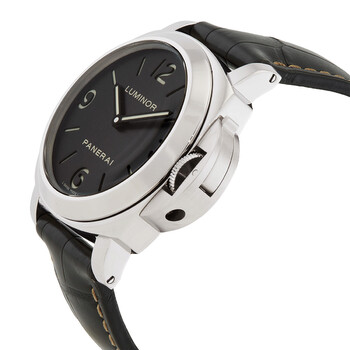 Silver-tone stainless steel case with a black leather strap. Fixed silver-tone stainless steel bezel. Black dial with luminous hands and index hour markers. Arabic numerals mark the 3, 6, 9, and 12 o'clock positions. Dial Type: Analog. Luminescent hands and markers. Panerai Calibre OP X Hand Wind movement, based upon ETA 6497-1, containing 17 Jewels, bitting at 21600 vph, and has a power reserve of approximately 56 hours. Scratch resistant sapphire crystal. Protected steel crown. Transparent see through case back. Cushion case shape, case size: 44 mm. Tang clasp. Water resistant at 300 meters / 1000 feet. Functions: hour, minute. Luminor Base Series. Dress watch style. Watch label: Swiss Made. Pre-owned Panerai Luminor Base Hand Wind Black Dial Men's Watch PAM00112.