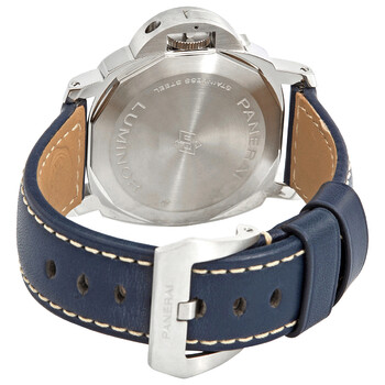Silver-tone stainless steel case with a blue leather strap. Fixed silver-tone stainless steel bezel. Blue dial with silver-tone hands and index hour markers. Arabic numerals appear at the 3, 6 and 12 o'clock positions. Dial Type: Analog. One subdial displaying: small second. Panerai Calibre P.6000 Hand Wind movement, containing 19 Jewels, bitting at 21600 vph, and has a power reserve of approximately 72 hours. Scratch resistant sapphire crystal. Solid case back. Cushion case shape, case size: 44 mm, case thickness: 13.05 mm. Tang clasp. Water resistant at 100 meters / 330 feet. Functions: hour, minute, small second. Luminor Series. Luxury watch style. Watch label: Swiss Made. Pre-owned Panerai Luminor Blu Mare Hand Wind Blue Dial Men's Watch PAM01085.