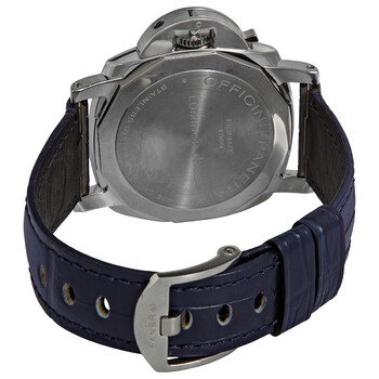 Silver-tone stainless steel case with a blue alligator leather strap. Fixed stainless steel bezel. Blue dial with rose gold-tone hands and index hour markers. Dial Type: Analog. Luminescent hands and markers. Date display at the 3 o'clock position. One subdial displaying: small seconds. Panerai Calibre P.900 Automatic movement, based upon Panerai OP XXXIV, containing 25 Jewels, bitting at 28800 vph, and has a power reserve of approximately 72 hours. Scratch resistant sapphire crystal. Pull / push crown. Solid case back. Cushion case shape, case size: 42 mm. Tang clasp. Water resistant at 30 meters / 100 feet. Functions: date, hour, minute, small second. Additional Info: original box, manual. Luminor Due Series. Luxury watch style. Watch label: Swiss Made. Pre-owned Panerai Luminor Due Automatic Blue Dial Men's Watch PAM01274.