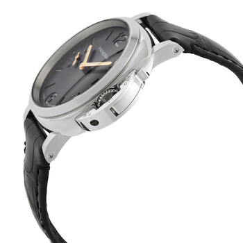 Silver-tone stainless steel case with a shiny black alligator leather strap. Fixed silver-tone stainless steel bezel. Grey dial with gold-tone hands and Arabic numeral hour markers. Dial Type: Analog. Date display at the 3 o'clock position. One subdial displaying: small second. Panerai Calibre P.900 Automatic movement, based upon Panerai OP XXXIV, containing 25 Jewels, bitting at 28800 vph, and has a power reserve of approximately 72 hours. Scratch resistant sapphire crystal. Solid case back. Cushion case shape, case size: 38 mm. Band width: 20 mm. Buckle clasp. Water resistant at 30 meters / 100 feet. Functions: date, hour, minute, second. Additional Info: original box, international warranty card, manual (complete accessories). Luminor Due Series. Luxury watch style. Watch label: Swiss Made. Pre-owned Panerai Luminor Due Automatic Grey Dial Men's Watch PAM01247.