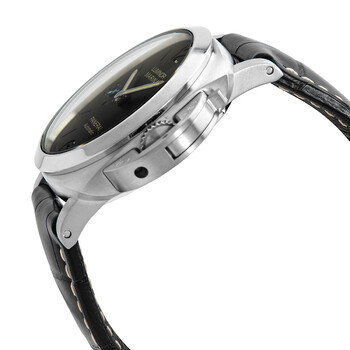 Silver-tone stainless steel case with a black leather strap. Fixed silver-tone stainless steel bezel. Black dial with index hour markers. Arabic numerals mark the 6, 9 and 12 o'clock positions. Dial Type: Analog. Luminescent hands and markers. Date display at the 3 o'clock position. One subdial displaying: small second. Panerai Calibre P.9010 Automatic movement, containing 31 Jewels, composed of 200 parts, bitting at 28800 vph, and has a power reserve of approximately 72 hours. Scratch resistant sapphire crystal. Screw down crown. Transparent case back. Cushion case shape, case size: 44 mm, case thickness: 15.6 mm. Tang clasp. Water resistant at 300 meters / 1000 feet. Functions: date, hour, minute, second, power reserve. Luminor Marina 1950 Series. Dive watch style. Watch label: Swiss Made. Pre-owned Panerai Luminor Marina 1950 Automatic Watch PAM01312.