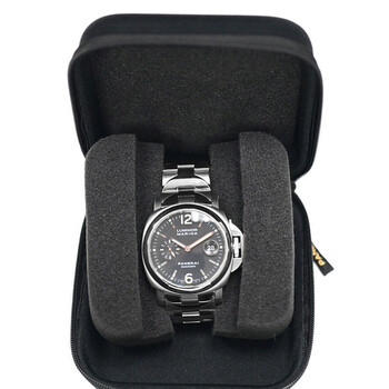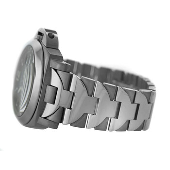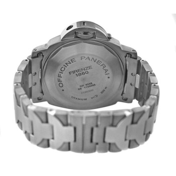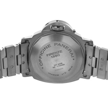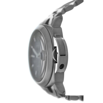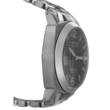 Grey titanium case with a silver-tone stainless steel bracelet. Fixed silver-tone stainless steel bezel. Black dial with silver-tone hands and Arabic numeral & index hour markers. Minute markers around the outer rim. Dial Type: Analog. Luminescent hands and markers. Date display at the 3 o'clock position. Panerai Calibre OP III Automatic movement, based upon 7750-P1, containing 21 Jewels, bitting at 28800 vph, and has a power reserve of approximately 42 hours. Scratch resistant sapphire crystal. Screw down crown. Solid case back. Cushion case shape, case size: 44 mm. Fold over clasp with a safety release. Water resistant at 300 meters / 1000 feet. Functions: date, hour, minute, second. Luminor Marina Series. Dive watch style. Watch label: Swiss Made. Pre-owned Panerai Luminor Marina Automatic Black Dial Men's Watch PAM00165.