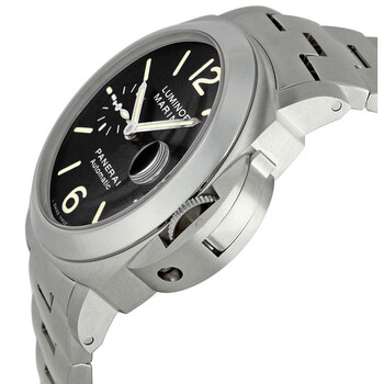Pre-owned Silver-tone stainless steel case with a silver-tone stainless steel bracelet. Stainless steel silver-tone stainless steel bezel. Black dial with luminous hands and luminous stick hour markers. Arabic numerals mark the 6 and 12 o'clock positions. Dial Type: Analog. Luminescent hands and markers. Date display at the 3 o'clock position. Seconds sub-dial at the 9 o'clock position subdials. Panerai Calibre OP III Automatic movement, based upon 7750-P1, containing 21 Jewels, bitting at 28800 vph, and has a power reserve of approximately 42 hours. Scratch resistant sapphire crystal. Fluted, protected crown. Solid case back. Cushion case shape, case size: 44 mm, case thickness: 16 mm. Band width: 23 mm. Double fold over hidden clasp. Water resistant at 300 meters / 1000 feet. Functions: date, hour, minute, small second, chronometer. Dive watch style. Watch label: Swiss Made. Panerai Luminora Marina Automatic Men's Watch PAM00299.