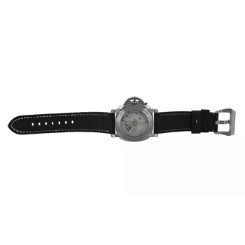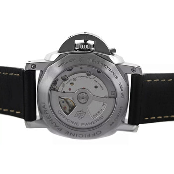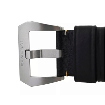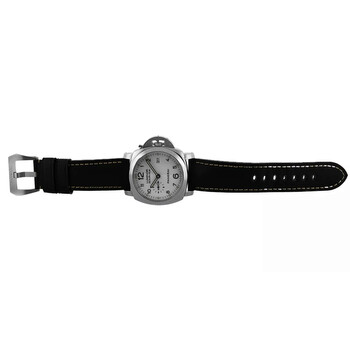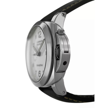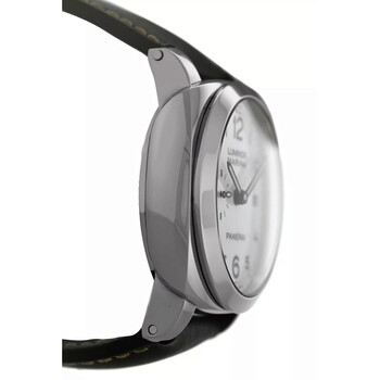 Silver-tone stainless steel case with a black leather strap. Fixed silver-tone stainless steel bezel. White dial with black hands and Arabic numeral & index hour markers. Minute markers around the outer rim. Dial Type: Analog. Luminescent hands and markers. Date display at the 3 o'clock position. Automatic movement. Scratch resistant sapphire crystal. Screw down crown. Transparent see through case back. Round case shape, case size: 45 mm. Buckle clasp. Water resistant at 300 meters / 1000 feet. Functions: date, hour, minute, second. Luminor Marina Series. Dive watch style. Watch label: Swiss Made. Pre-owned Panerai Luminor Marina Automatic White Dial Men's Watch 1950.