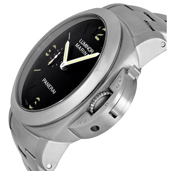 Pre-owned Silver-tone stainless steel case with a silver-tone stainless steel bracelet. Fixed silver-tone stainless steel bezel. Black dial with luminous hands and stick hour markers. Arabic numerals mark the 6, 9 and 12 o'clock positions. Dial Type: Analog. Luminescent hands and markers. Date display at the 3 o'clock position. Small seconds sub-dial at the 9 o'clock position subdials. Panerai Calibre P.9000 Automatic movement, containing 28 Jewels, composed of 197 parts, bitting at 28800 vph, and has a power reserve of approximately 72 hours. Scratch resistant sapphire crystal. Fluted protected crown. Skeleton case back. Cushion case shape, case size: 44 mm, case thickness: 15 mm. Band width: 24 mm. Double fold over hidden clasp. Water resistant at 100 meters / 330 feet. Functions: date, hour, minute, small second. Sport watch style. Watch label: Swiss Made. Panerai Luminor 1950 Marina 3 Days Automatic Men's Watch PAM00328.