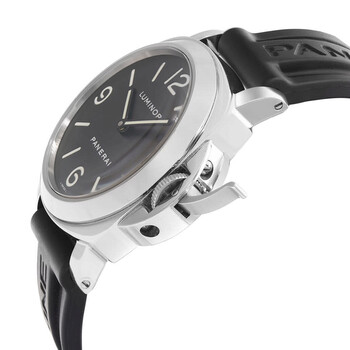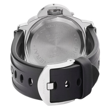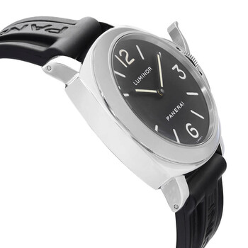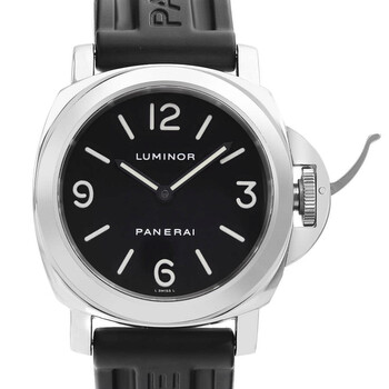 Silver-tone stainless steel case with a black rubber strap. Fixed silver-tone stainless steel bezel. Black dial with black hands and Arabic numeral & index hour markers. Dial Type: Analog. Luminescent hands. Panerai Calibre OP I Hand Wind movement, based upon ETA 6497-1, containing 17 Jewels, bitting at 21600 vph, and has a power reserve of approximately 56 hours. Scratch resistant sapphire crystal. Pull / push crown. Solid case back. Round case shape, case size: 44 mm, case thickness: 14 mm. Band width: 22 mm, band length: 8 inches. Buckle clasp. Water resistant at 300 meters / 1000 feet. Functions: hour, minute. Panerai Luminor Series. Luxury watch style. Watch label: Swiss Made. Pre-owned Panerai Panerai Luminor Hand Wind Black Dial Men's Watch PAM00002.