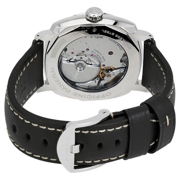 Pre-owned Silver-tone stainless steel case with a black leather strap. Fixed silver-tone stainless steel bezel. Black dial with luminous silver-tone hands and index hour markers. Arabic numerals mark the 6, 9 and 12 o'clock positions. Dial Type: Analog. Luminescent hands and markers. Date display at the 3 o'clock position. One- 24 hour indicator subdials. Panerai Calibre P.4002 Automatic movement, containing 31 Jewels, composed of 288 parts, bitting at 28800 vph, and has a power reserve of approximately 72 hours. Scratch resistant sapphire crystal. Screw down crown. Transparent case back. Cushion case shape, case size: 45 mm, case thickness: 13 mm. Band width: 24 mm. Tang clasp. Water resistant at 100 meters / 330 feet. Functions: date, GMT, second time zone, hour, minute, second, power reserve indicator. Luxury watch style. Watch label: Swiss Made. Panerai Radiomir 1940 3 Days GMT Power Reserve Automatic Men's Watch PAM00628.