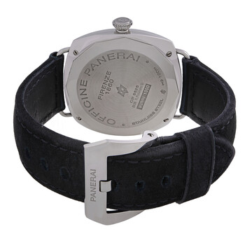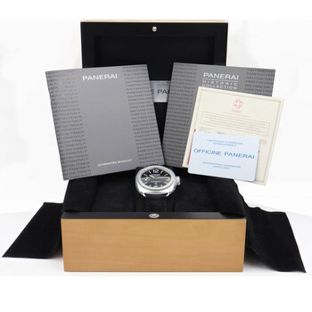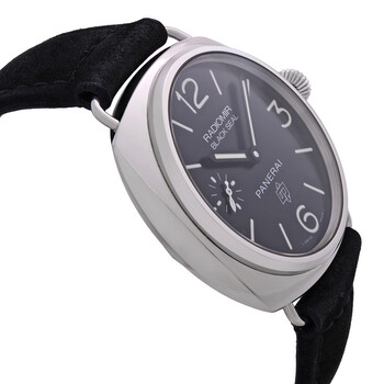 Silver-tone stainless steel case with a black leather strap. Fixed silver-tone stainless steel bezel. Black dial with luminous black hands and index hour markers. Arabic numerals mark the 6 and 12 o'clock positions. Minute markers around the outer rim. Dial Type: Analog. Luminescent hands and markers. One subdial displaying: small second. Panerai Calibre OP II Hand Wind movement, based upon ETA 6497-1, containing 17 Jewels, bitting at 21600 vph, and has a power reserve of approximately 56 hours. Scratch resistant sapphire crystal. Fluted crown. Solid case back. Cushion case shape, case size: 45 mm, case thickness: 15.2 mm. Band width: 22 mm, band length: 8 inches. Buckle clasp. Water resistant at 100 meters / 330 feet. Functions: hour, minute, small second, chronometer. Radiomir Series. Casual watch style. Watch label: Swiss Made. Pre-owned Panerai Radiomir Black Dial Men's Watch PAM00380.